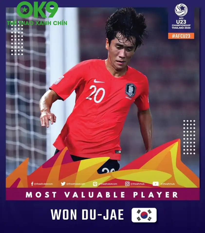 Bước sang năm 2020, danh hiệu MVP đã gọi tên Won Du-jae – tiền vệ phòng ngự “cứng cựa” của Hàn Quốc. Chàng trai này chính là trụ cột không thể thiếu trong hành trình đăng quang của đội bóng xứ kim chi tại Thái Lan. Dù không phải lúc nào cũng thi đấu trọn vẹn từng phút, nhưng Won Du-jae lại là người thực hiện tới 306 đường chuyền thành công, con số nhiều nhất toàn đội, cho thấy khả năng điều phối bóng và tầm ảnh hưởng lên lối chơi là “không phải dạng vừa đâu”.